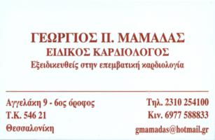 Ο ειδικός καρδιολόγος Γιώργος Μαμαδάς διατηρεί το ιατρείο του στην οδό Αγγελάκη στη Θεσσαλονίκη. Με άρτια εκπαίδευση, πολυετή εμπειρία και ειδίκευση στον χώρο της επεμβατικής καρδιολογίας, ο Γιώργος Μαμαδάς πραγματοποιεί όλο το εύρος των απαραίτητων καρδιολογικών εξετάσεων για τον έλεγχο της καρδιάς.Σ’ ένα φιλικό προς τον ασθενή περιβάλλον, ο ιατρός παρέχει τις υπηρεσίες του με υπευθυνότητα και πάνω απ’ όλα με σεβασμό προς τον άνθρωπο. Διαθέτοντας άριστη επιστημονική κατάρτιση, πραγματοποιεί όλες τις διαγνωστικές εξετάσεις στο πλήρως εξοπλισμένο ιατρείο του, παρέχοντας έγκυρη ιατρική γνωμάτευση για κάθε περιστατικό. Παράλληλα, προσφέρει έγκυρη και επιστημονική ενημέρωση και συμβουλές, με βάση όλα τα νεότερα δεδομένα, εξελίξεις και μεθόδους όσον αφορά την πρόληψη αλλά και την αντιμετώπιση των παθήσεων της καρδιάς. Στόχος του είναι πάντα η παροχή εξατομικευμένων ιατρικών υπηρεσιών υψηλής ποιότητας σε κάθε ασθενή.Ο Γιώργος Μαμαδάς είναι συνεργάτης του Κυανού Σταυρού.Ο ιατρός δέχεται καθημερινά στο ιατρείο του κατόπιν ραντεβού
